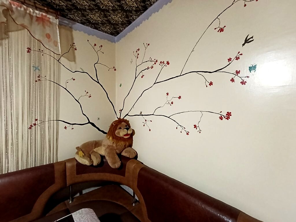 Рисовал обычной масляной краской, использовал маленькие кисти и спичку заострённую