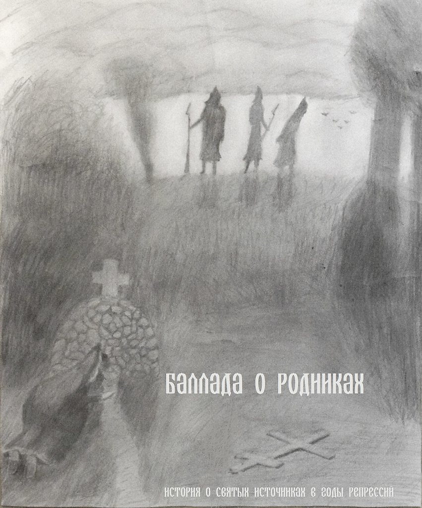 На картине изображен святой источник, мощенный булыжником с крестом наверху. У источника изображен человек в монашеской одежде дореволюционной эпохи. Рядом изображен сломаный большевиками деревянный крест, лежащий в траве. Человек склонился к роднику, чтобы умыться водой и еще не знает, какая беда его ждет. Тем времене неподалеку на вершине холма два красноармейца уже арестовывают другого священника, пришедшего на родник и уводят его на расстел. Картина выполнена в серых тонах в виде старой фотографии в качестве иллюстрации к песне "баллада о родниках" , разные варианты которой можно услышать по ссылкам :