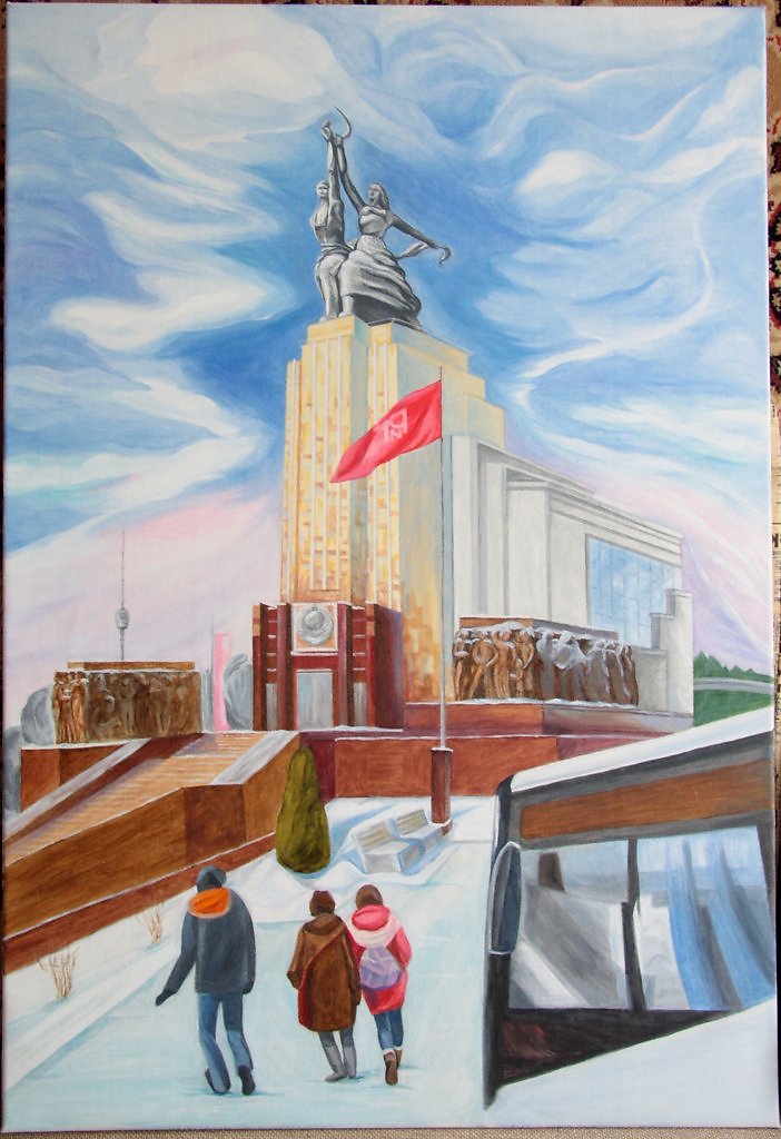 Городской архитектурный зимний пейзаж. На полотне изображен музейно-выставочный центр "Рабочий и колхозница", который являясь выдающимся образцом архитектурного и монументального искусства советского периода работы Б.Иофана и В.Мухиной, становится площадкой современного искусства и точкой притяжения современного зрителя.