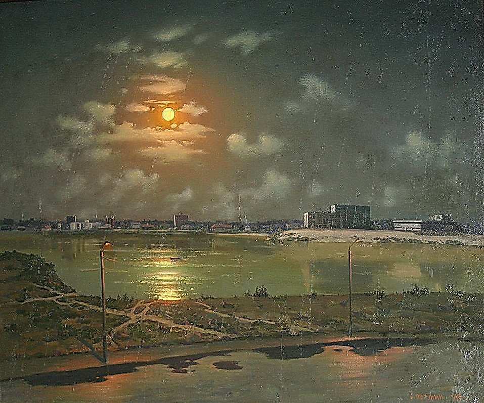 Тут я изобразил центр Йошкар-Олы,столицы республики Марий Эл на реку Кокшагу.Холст,Масло.Размер 90х12см.Год 1996.