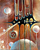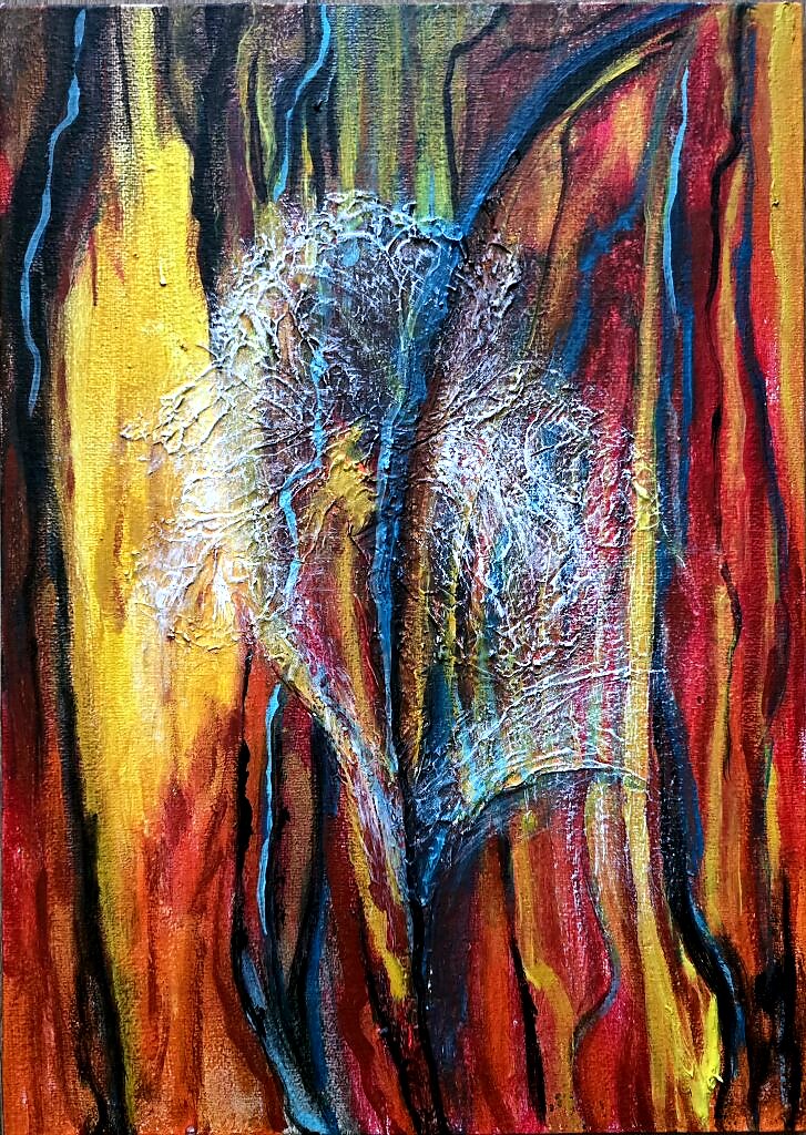 Внутри этих тёплых, пульсирующих полос скрывается изящное сплетение тонких нитей или кружева, мягко светящихся на более тёмном фоне - след предыдущей работы, который невозможно полностью скрыть. Оно выглядит почти как хрупкий, естественный росток или нить или изумрудные узоры, изящно выгравированные на стекле. Взаимодействие смелых тёплых вертикалей и хрупкой центральной белой массы создаёт динамичный контраст: прочность и хрупкость, тепло и прохлада, плотность и изящество.