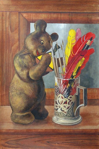 Эта картина в стиле "натюрморты-обманки" из серии "Портреты любимых с детства игрушек". Материал: ватман, ПВА темпера.
