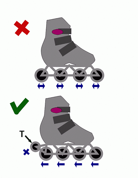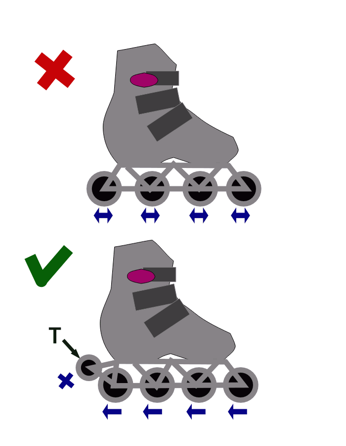 Вместо распространенных ныне роликовых коньков с вращающимися в обе стороны роликами для езды по улицам надо выпускать коньки с роликами, вращающимися только в одну сторону /1-й рис./. (Т - тормозной ролик с ограниченной прокруткой, позволяющий тормозить /2-й рис./.)