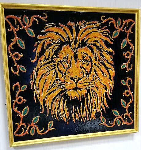 Работа выполнена цветным песком на деревянной основе, покрыта акриловым лаком.