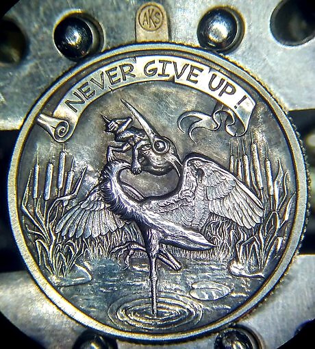 Работа выполнена с помощью ручного гравирования на аверсе серебряной американской двадцатипятицентовой монеты. Внутри монеты размещён механизм, который приводится в движение нажатием кнопки, расположенной сверху. При этом цапля открывает клюв, создавая иллюзию проглатывания лягушки. Данная работа относится к категории механических монет или монет с секретом, что делает её уникальным произведением искусства.