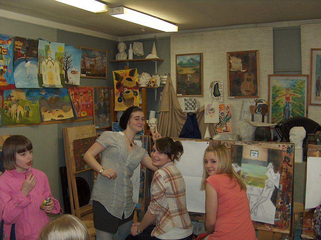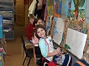 Ещё надо сфотографировать юных художников за работой, а кистями возле полотен! |