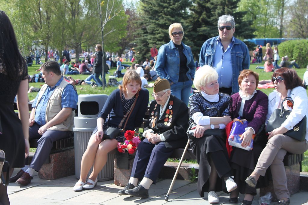 Скамья на Поклонной горе в День Победы объединила несколько поколений. В этот день в толпах людей с каждым годом становится все меньше и меньше ветеранов.