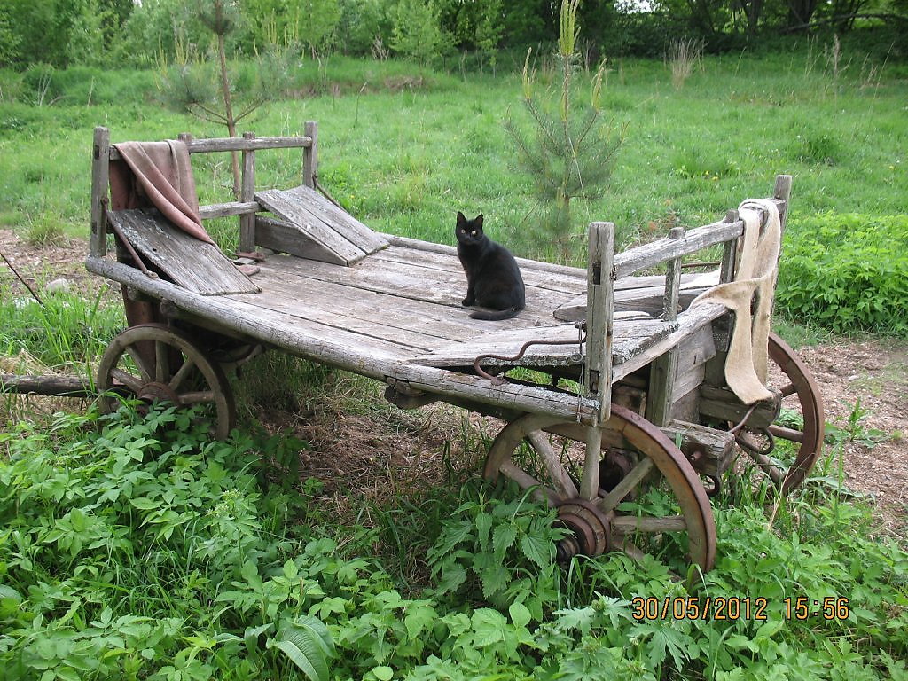 кошка какбы сказочная над телегой управляемой ею, она ждёт пока мы сядем и поехали - типичные пугалки деревенских фанов гоголей и спилбергов