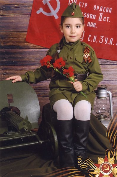 Очень трогательное фото, Надежда! Девчушка, как символ подростающего поколения, в военной форме и на фоне знамени с гвоздиками в руке - очень символично! Удачи Вам!