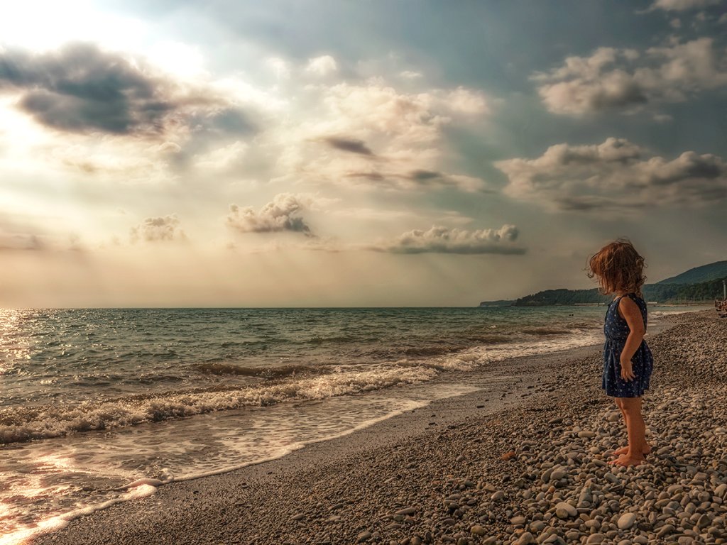 Маленькая Ассоль? Прекрасное фото, красивый морской пейзаж, особенно небо! Все в гармонии. Удачи!