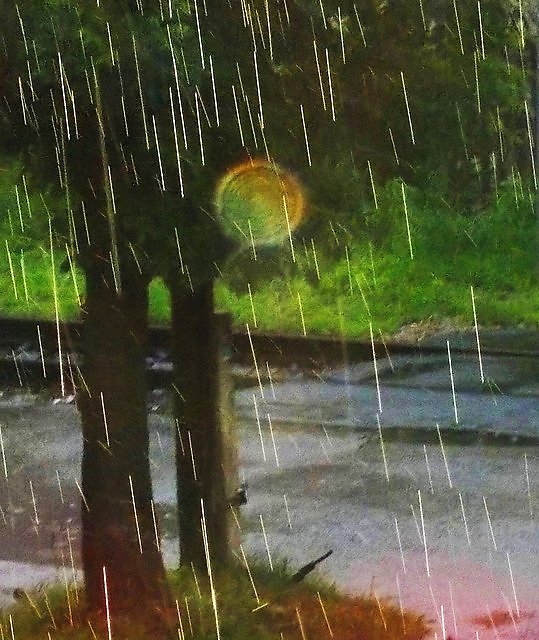 Идущий дождь, а сверху капли освещает свет фонаря, а "плазмоид" в центре это блик на фотоаппарате.