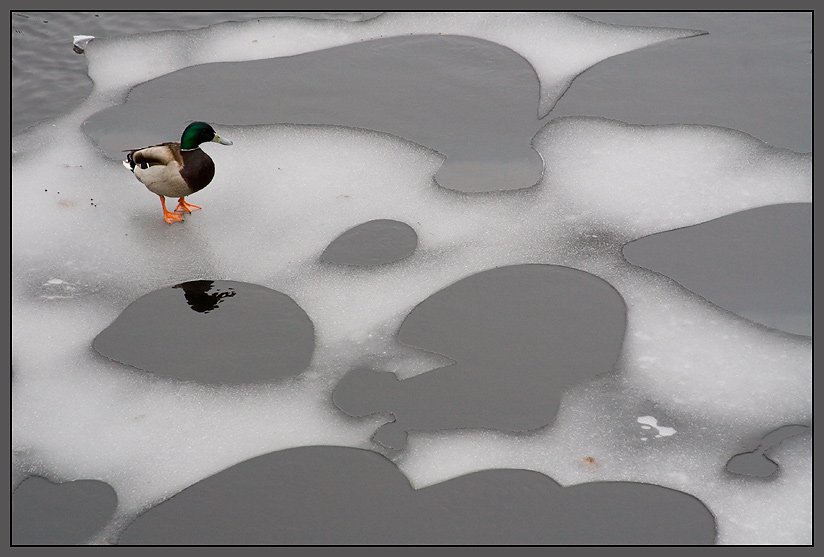 Красивая,интересная фотография,отлично!Бедная уточка,холодно ей.
