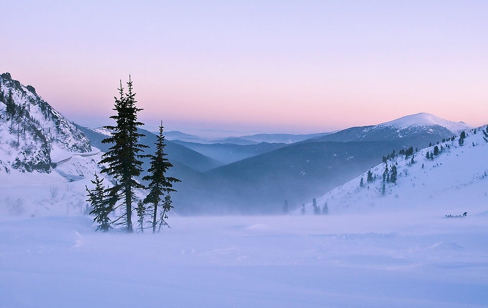 Всё получилось очень хорошо: и светящееся небо, и одиноко стоящие ели, и снежная пустыня на переднем плане! И, конечно, горы! |