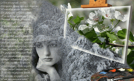 Иллюстрация-коллаж: Две собственных фотоработы (зимний лес, ветка яблони) + элементы клипарта (девушка (инет), и мольберт c кистью и палитрой из скрап-набора "Маленький художник" с сайта www.0lik.ru), обработка GIMP 2.6