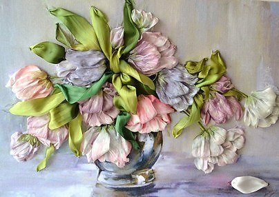 Картина вышита широкими шелковыми лентами китайского производства. Цветы расписаны вручную немецкими красками для шелка. Основа картины - принт, выполненный на хлопковой ткани.